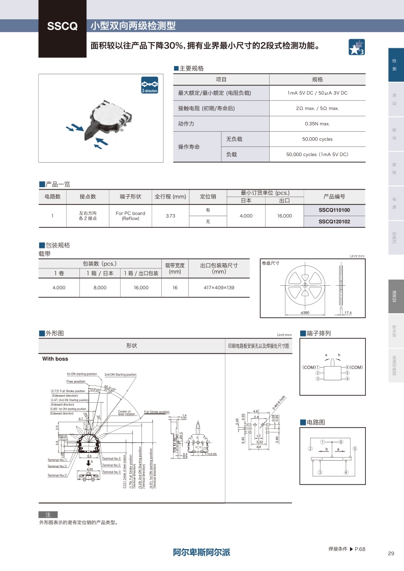 臥式 / 小型雙向兩級(jí)檢測(cè)型 ? 最大額定值:1mA 5V DC ? 動(dòng)作力:0.35N max. ? 操作壽命(無(wú)負(fù)載):50000 cycles