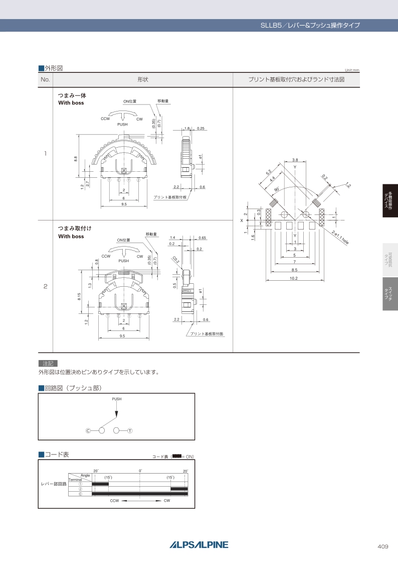 產(chǎn)品編號 照片 操作軸數(shù) 軸材質(zhì) 操作部形狀 按動ON開關(guān) 動作力 行程(中心按動) 定位銷 接觸電阻 尺寸(W×D×H)