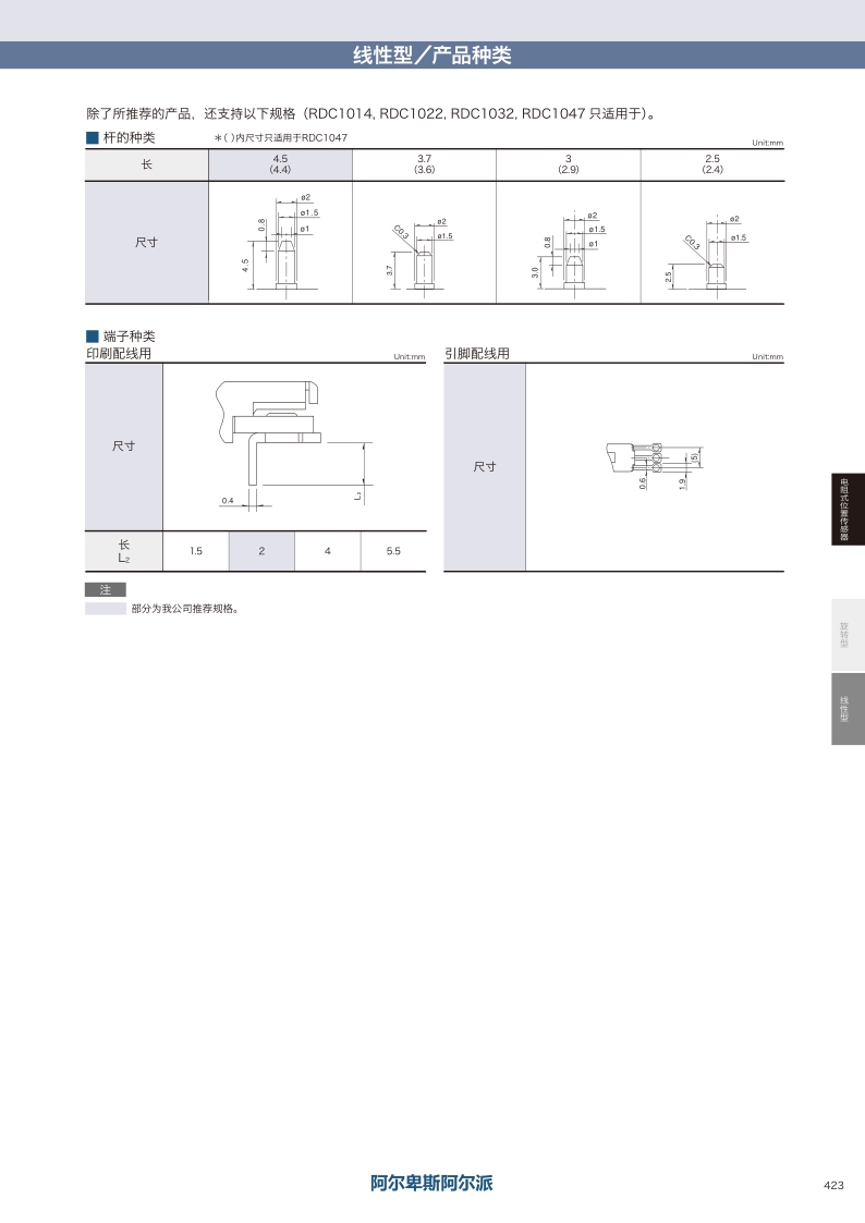 產(chǎn)品編號 照片 行程 操作部方向 總電阻值 線性保證范圍 線性 動作壽命 額定電壓 桿長 端子長 尺寸
