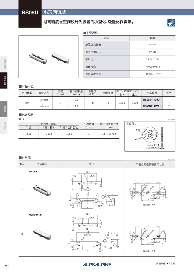 RS08U系列通過高精度省空間設(shè)計為裝置的小型化、輕量化作貢獻(xiàn)。小形回流 ? 行程:8mm ? 電阻體數(shù):單聯(lián) ? 操作方向:Vertical Horizontal。