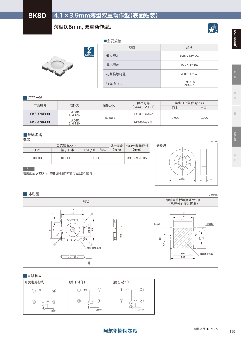 薄形0.6mm 雙重動(dòng)作型?操作感覺(jué):敏感 ? 貼裝方式:表面貼裝 ? 尺寸(W×D×H):4.1×3.9×0.6mm ? 特長(zhǎng):雙動(dòng)作。