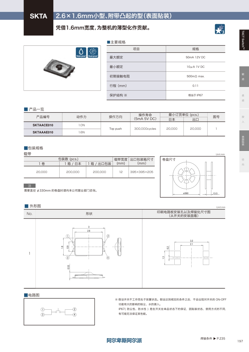 憑借1.6mm寬度 為整機(jī)的薄型化作貢獻(xiàn),操作感覺:敏感 ? 貼裝方式:表面貼裝 ? 尺寸(W×D×H):2.6×1.6×0.53mm ? 特長:小型?薄型 防水及防塵型 IP67。