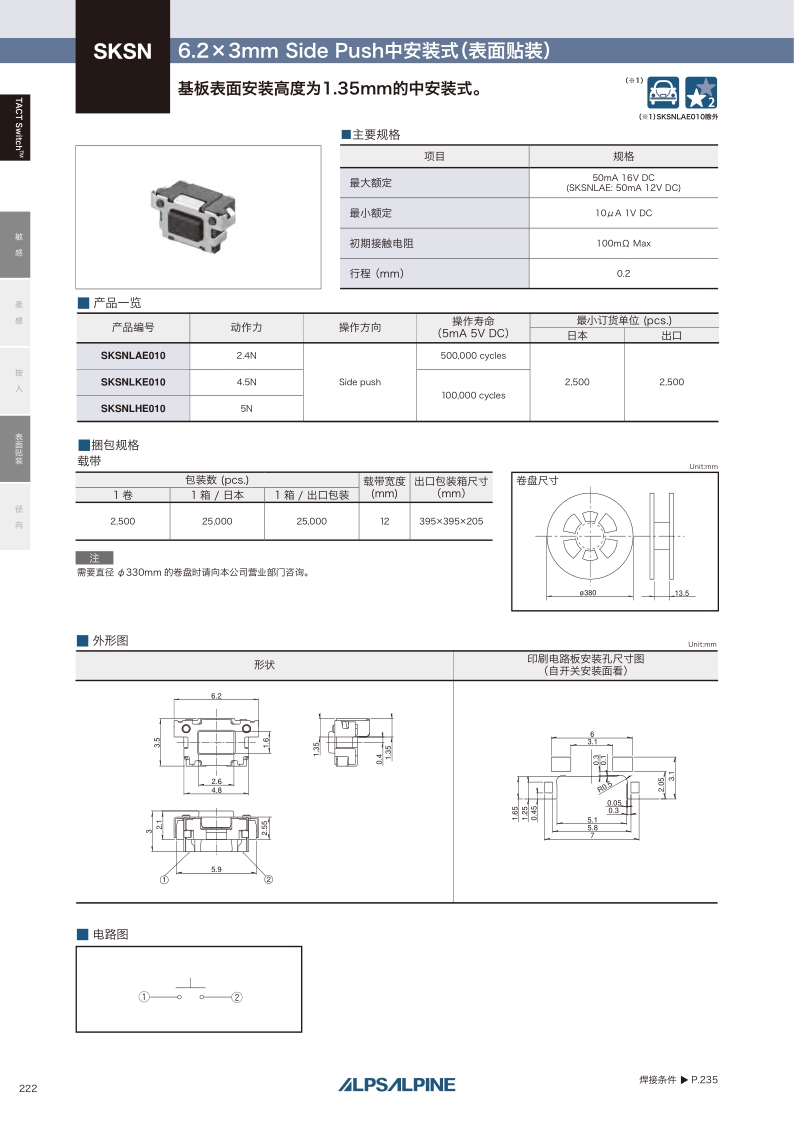 SKSNLAE010 照片 Surface mount 2.4N Side push 0.2mm 3.5mm 500,000 cycles 100mΩ max. 6.2×3.0×3.5