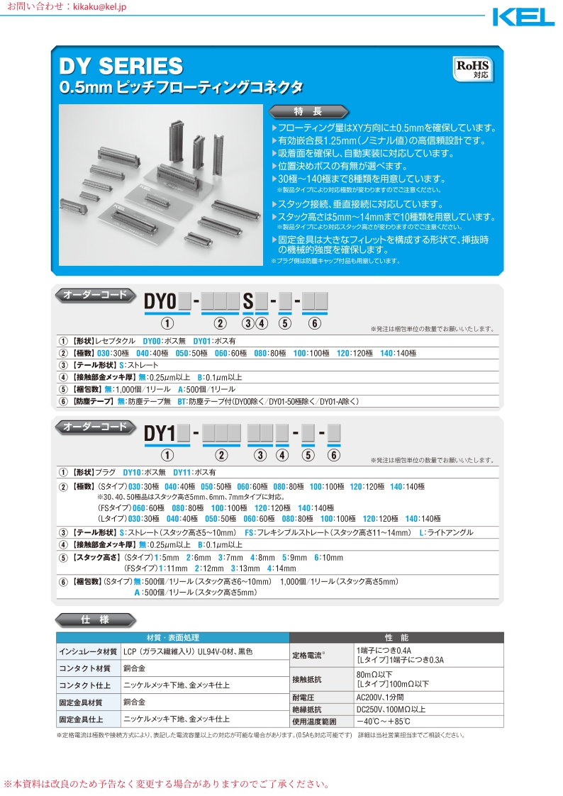KEL浮動(dòng)連接器 0.5mm間距板對(duì)板對(duì)板連接器KEL_連接器_浮動(dòng)連接器.DY系列的間距為0.5mm,但在X和Y方向上可實(shí)現(xiàn)±0.5mm的移動(dòng)間距同時(shí)還能保證1.25mm的有效嵌合高度??捎糜谲?chē)載多媒體、汽車(chē)液晶儀表盤(pán)、無(wú)人機(jī)云盤(pán)、LED顯示屏等。