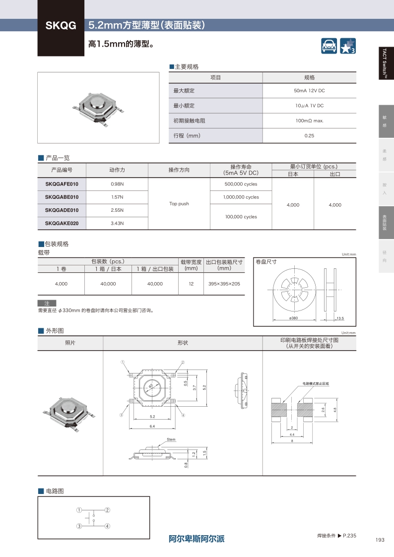 SKQGAKE020 照片 Surface mount 3.43N Top push 0.25mm 1.5mm 100,000 cycles 100mΩ max. 5.2 x 5.2×1.5