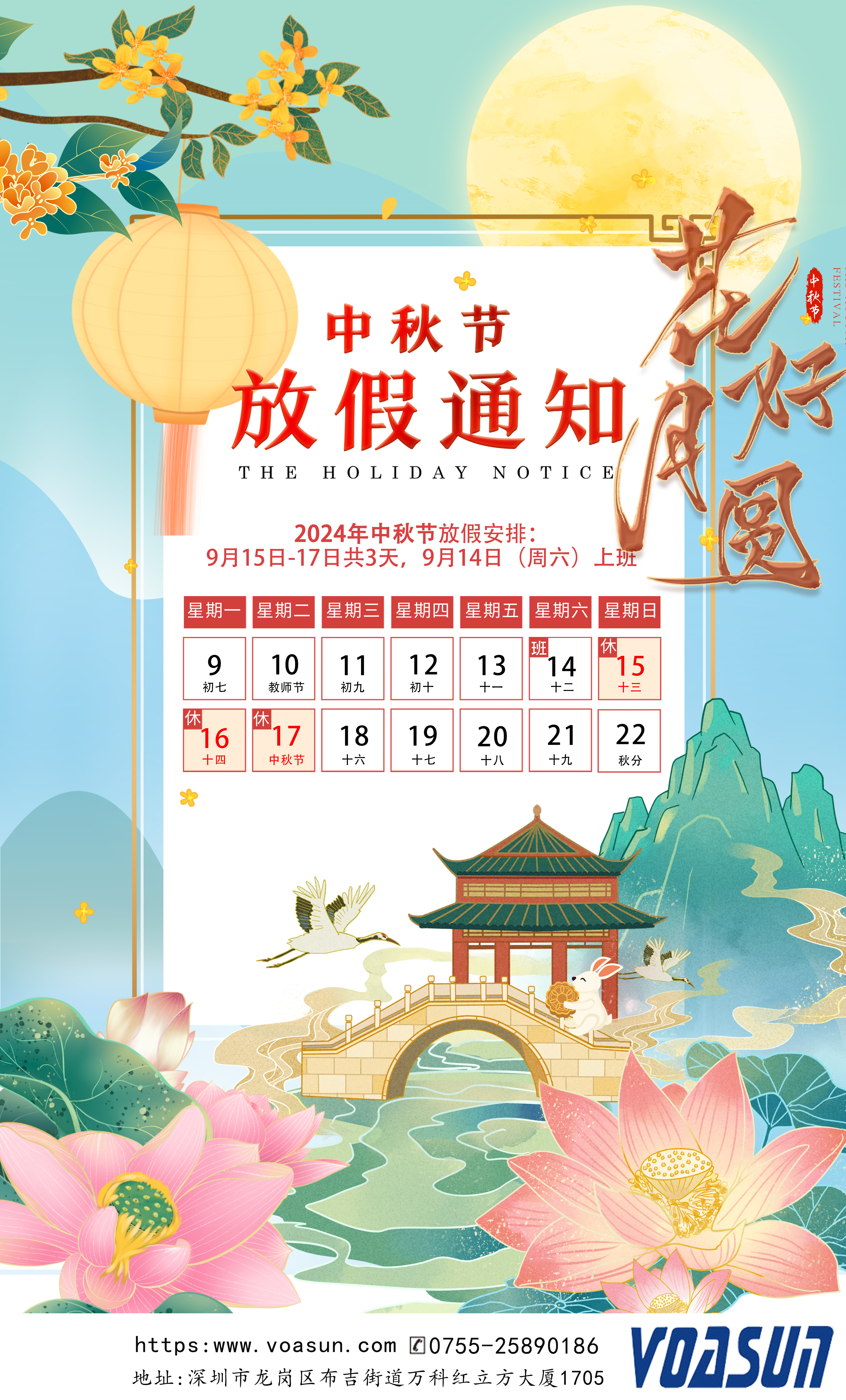 根據(jù)國家及公司相關(guān)規(guī)定,2024年中秋節(jié)放假及調(diào)班安排:9月15日、16日、17日放假,共3天;9月14日(周六)上班。